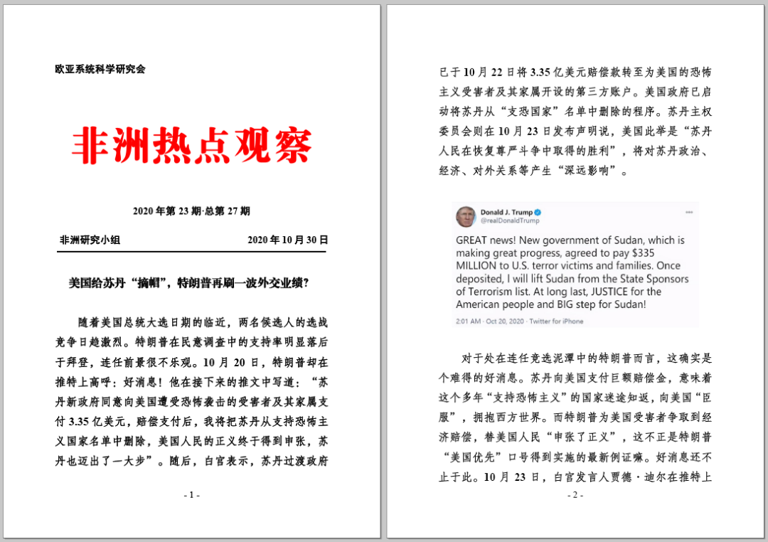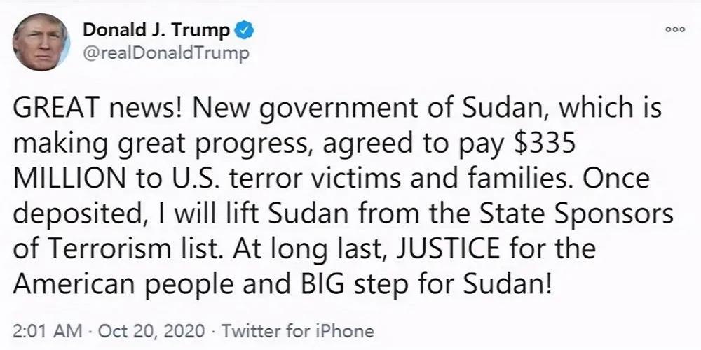 随着美国总统大选日期的临近,两名候选人的选战竞争日趋激烈。特朗普在民意调查中的支持率明显落后于拜登,连任前景很不乐观。10月20日,特朗普却在推特上高呼:好消息!他在接下来的推文中写道:“苏丹新政府同意向美国遭受恐怖袭击的受害者及其家属支付3.35亿美元,赔偿支付后,我将把苏丹从支持恐怖主义国家名单中删除,美国人民的正义终于得到申张,苏丹也迈出了一大步”。随后,白宫表示,苏丹过渡政府已于10月22日将3.35亿美元赔偿款转至为美国的恐怖主义受害者及其家属开设的第三方账户。美国政府已启动将苏丹从“支恐国家”名单中删除的程序。苏丹主权委员会则在10月23日发布声明说,美国此举是“苏丹人民在恢复尊严斗争中取得的胜利”,将对苏丹政治、经济、对外关系等产生“深远影响”。
