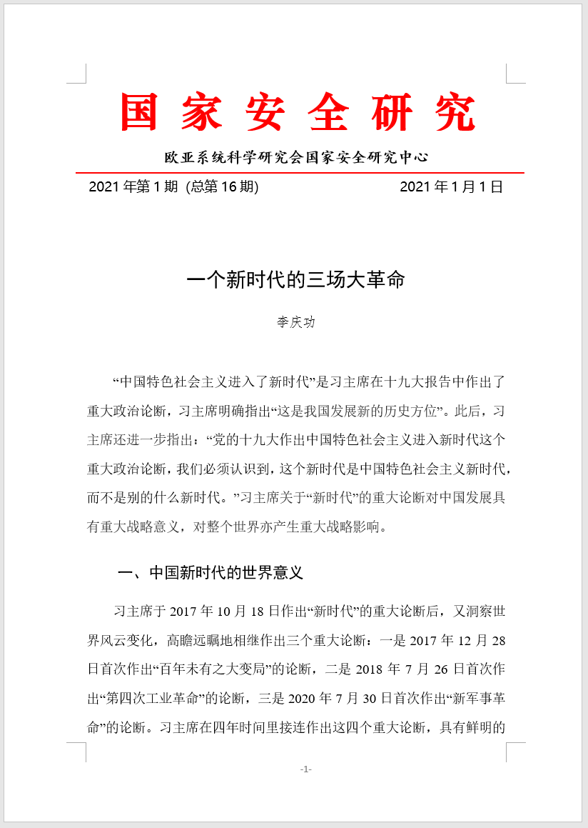欧亚系统科学研究会国家安全研究中心于2021年1月1日发布2021年第1期《国家安全研究》——一个新时代的三场大革命,作者李庆功。