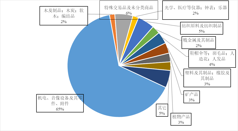 其次,从中越贸易的具体情况看,两国的产业链联系正在逐步加深。近年来中国对越贸易呈现顺差格局,随着总体贸易规模的扩大,2020年中国对越顺差额度也有所增加。在过去一年间,中国对越南商品出口额为1138亿美元,同比增长16.3%;而中国自越南商品进口额为745亿美元,同比增长22.4%,全年中国对越贸易顺差规模为393亿美元,与上一年度相比扩大161亿美元。就中国对越南出口而言,“机电、音像设备及其零件、附件”是最主要的商品,2020年中国对越出口该类商品金额达525亿美元,在中国对越商品出口额中占比为46%,同比增长82%。其次是“纺织原料及纺织制品”和“贱金属及其制品”两类商品,占比分别为13%和8%(详见图1)。这三类商品也是2020年中国对越出口的增长点所在。而从中国自越南进口的商品结构来看,“机电、音像设备及其零件、附件”占比高达65%,其次是“特殊交易品及未分类商品”和“纺织原料及纺织制品”,二者占比分别为5.6和5.3%(详见图2)。其中“机电、音像设备及其零件、附件”和“纺织原料及纺织制品”也是中国自越南进口额增长的主要动力源,二者同比增长率分别为48%和23%。