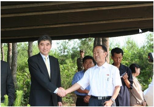 2008年6月27日,在朝鲜核工业重地宁边,美国国务院官员金星(左)和朝鲜原子能研究院核保障处处长李英浩在冷却塔被爆破后握手。