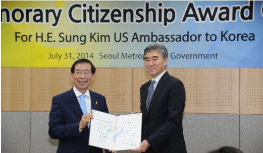 2014年7月31日,时任首尔市长朴元淳向进行赠送“首尔市荣誉市民证书”。