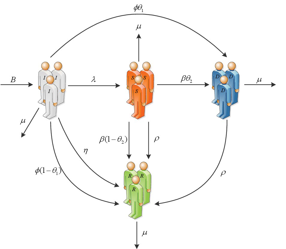 本文构建的模型基于经典的SIR模型,假设谣言在一个存在 个节点的混合均匀网络中传播,每个节点代表社交媒体中的一个用户,总节点数 在任何时候都是可变的。根据之前的假设,社交媒体中用户分为四类:无知者(Ignorant)、谣言传播者(Spreader)、辟谣者(Debunker)和免疫者(Resistant),其人数分别用 、 、 和 表示。