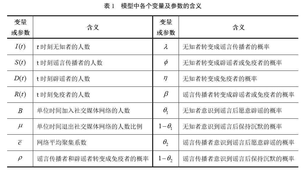 (3)社交媒体用户是通过彼此之间的关注关系来实现信息分享,因此社交网络的拓扑结构,必然会对谣言传播过程产生影响。为此,本文在构建的模型中,引入了网络平均聚集系数,以刻画社交网络结构的紧密程度。