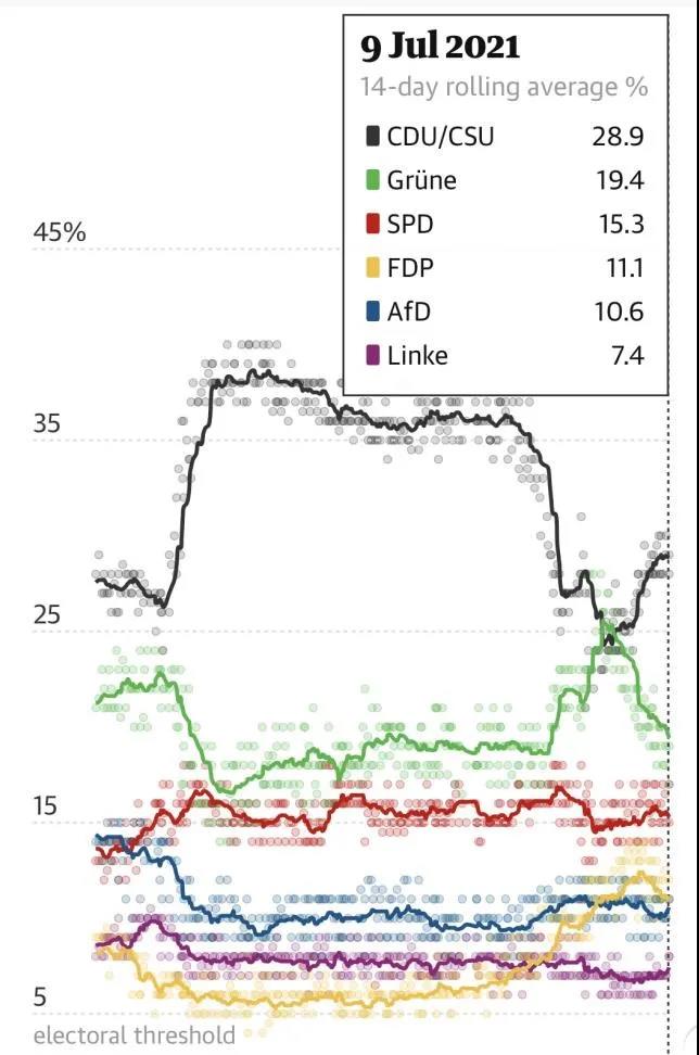 德国大选各政党近期民调,默克尔所属的联盟党领先(CDU/CSU)