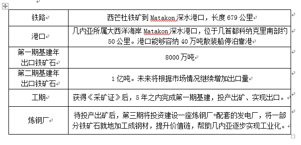 (六)2019年7月,几内亚政府就西芒杜1、2号区块的采矿权进行国际公开招标。11月,赢联盟旗下博凯矿业公司(Société Minières de Boké, SMB)独家中标,近期将进入协议谈判阶段。几内亚政府聘请法国E&Y咨询事务所(Cabinet Ernst & Young)负责1、2号区块开发项目的技术评估、技术咨询、项目评审、专家意见等。赢联盟承诺西芒杜铁矿的所有基础设施将全部建设在几内亚境内,赢联盟在投标书中提出的基建计划总体如下: