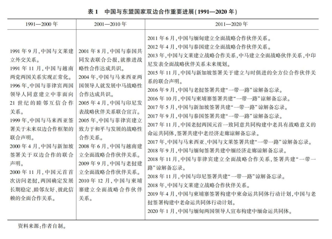 1991年,中国与所有东南亚国家建立关系、恢复关系或关系正常化。1997年12月,中国—东盟领导人会议发表了关于建立面向21世纪的睦邻互信伙伴关系的联合宣言,成为中国与东盟国家深化双边关系的指导准则。在21世纪的前21年,中国与所有东盟国家的关系都有所发展,建立了各种形式的伙伴关系。2013年习近平主席在印尼国会发表演讲,首次提到愿同东盟国家缔结睦邻友好合作条约;2019年中国同柬埔寨、老挝先后签署了《构建命运共同体行动计划》;2020年1月习近平主席访问缅甸期间,中缅双方就构建中缅命运共同体达成重要共识。近三十年间中国与东盟国家的双边合作成果丰硕,重要进展参见表1。