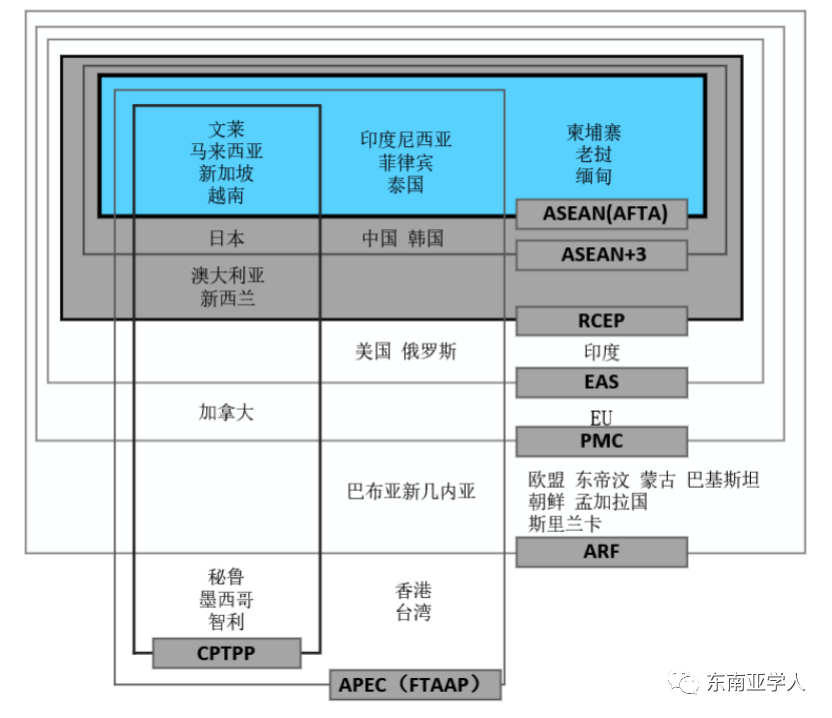 图1 以东盟为中心的东亚区域经济合作框架;图源:作者自制;注释:ASEAN:东盟;AFTA:东盟自由贸易区;RCEP:《区域全面经济伙伴关系协定》;PMC:东盟部长扩大会议;ARF:东盟地区论坛;CPTTP:全面与进步跨太平洋伙伴关系协定;APEC:亚太经合组织;FTAAP:亚太自由贸易区。