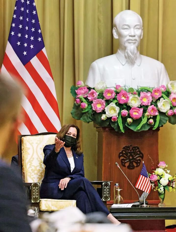 2021年8月25日,美国副总统哈里斯在访问越南期间接受提问一幕