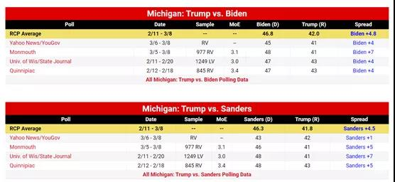 4. Michigan General Election Polls.RealClear Politics. Retrieved March 11, 2020. https://www.realclearpolitics.com/epolls/2020/president/Michigan.html