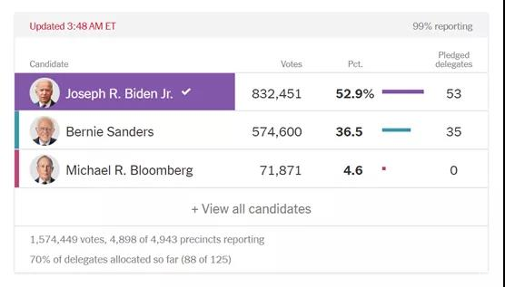 密歇根州的初选,毫无疑问指向的是更加清晰的,由拜登领跑的局面。在朝向获得全国大会上1991名代表支持票的路程中,现在拜登已经处在上风。虽然当前新冠肺炎在美国蔓延的疫情,有可能会给选举进程带来一些变数,比如竞选集会的取消,本周日的电视辩论不安排现场观众等等,但就基本盘而言,密歇根一役,初选的路途已经明朗了起来。