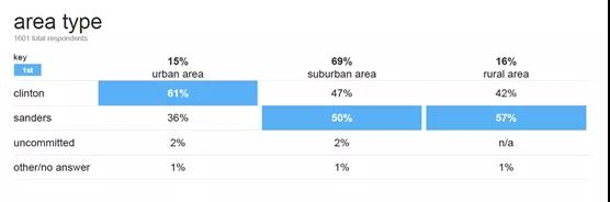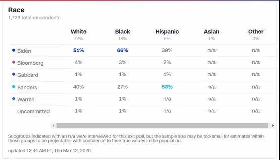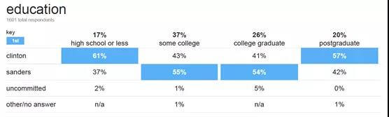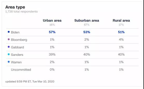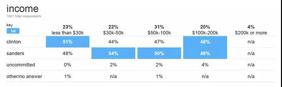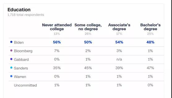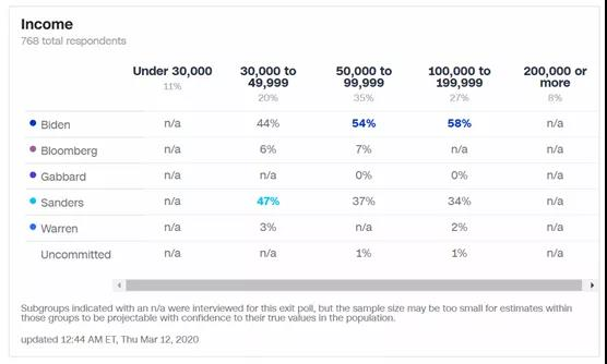 四年前,桑德斯能够吸引到的选票,如果按照收入划分,他在不同阶层上有着极大的竞争力,但本次初选,他的优势弱化了不少,不仅在较高收入的阶层上落后于拜登,甚至在他一直以来顺风顺水的较低收入人群中,他的优势也不再如对阵希拉里时显著。按收入水平统计的出口民调没有倒向桑德斯而是倾向于拜登,这意味着蓝领工人并没有跟随四年前势头,继续广泛支持桑德斯的竞选。