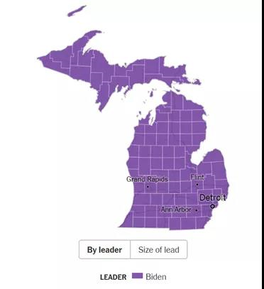 而如果对比区域分布状况,桑德斯的退步就更加明显,在与希拉里竞争时收获的农村与城郊地区选票,如今不再是他的优势盘,拜登不仅如同四年前的希拉里一样轻松拿下东南部人口密集的城市地区,甚至更进一步,在底特律(Detroit)、大急流城(Grand Rapids)等主要城市的边缘地区,以及密歇根西部与北部的广大农村区域收获大量支持,全面击败桑德斯,如此,按县份统计得票,拜登甚至都没有给桑德斯留下一点机会,彻底翻转了四年前的投票分布。