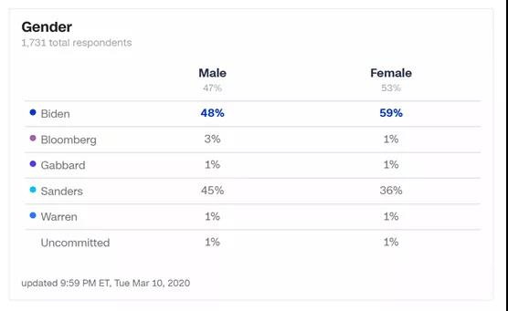 反观竞争对手,克洛布彻退选后,和早先退选的加州参议员哈莉丝(KamalaHarris)共同背书拜登,拜登在建制派的支持力量在这两位女性参议员的参与下进一步稳固,而他在女性选民中较大的优势也逐步确立下来。桑德斯在密歇根的拉票,最终并没有改变沃伦退选后其支持者的分布局面。
