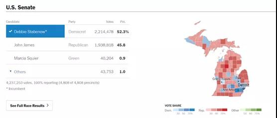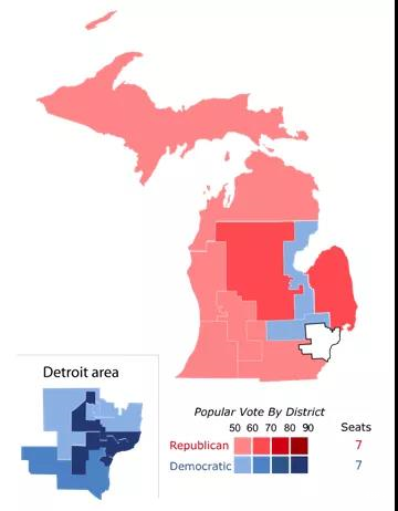 密歇根州作为“铁锈带(Rust Belt)”地区之一,历来是选举中的兵家必争之地,民主党在东南部城镇地区的优势与共和党在广大西部、北部农村地区的优势是密州政治版图的基本结构。2014与2016两个竞选周期,民主党人在密州处于不利地位,共和党籍州长Snyder在2014选举中连任成功,两届众议院选举,密州的14个席位中共和党都成功掌握9席。到了2018年,特朗普执政对美国国内社会的撕裂,让民主党在密州找到了机会,中期选举的密州民主党收获颇丰,众议院选举成功挑落两个共和党席位,两党席次变为7比7;州长选举,民主党候选人Whitmer以较大优势战胜对手;参议员Stabenow连任,保持密州参议员全取的局面。