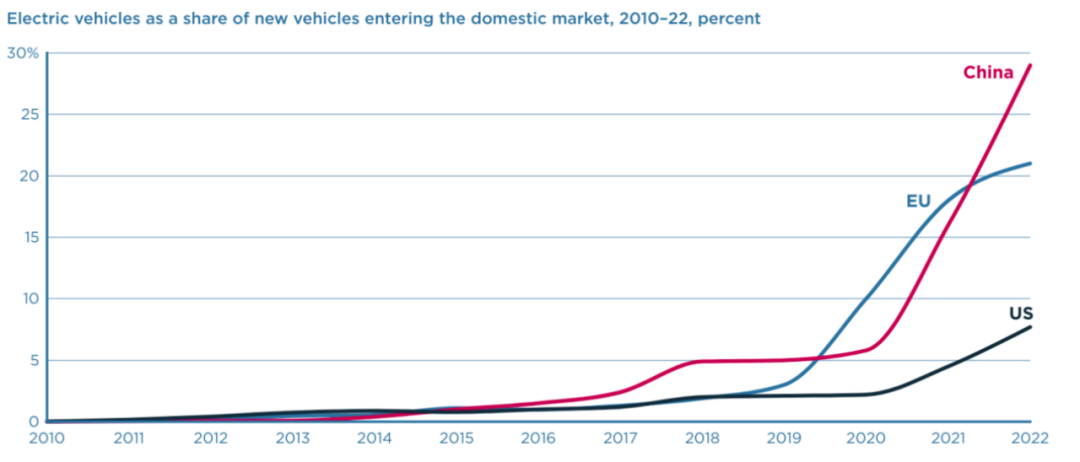 ▲ 美国在电动汽车(包括电池电动汽车和插电式混合动力汽车)应用方面落后于欧盟和中国;图中数字基于车辆数量,而非其价值。(资料来源:国际能源署)