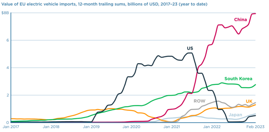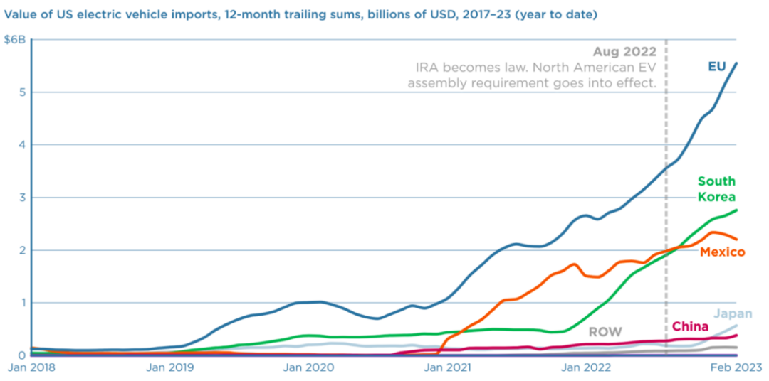 ▲ 尽管有IRA,美国从欧盟和韩国进口的电动汽车仍在继续增长;ROW=世界其他地区;(资料来源:美国国际贸易委员会)