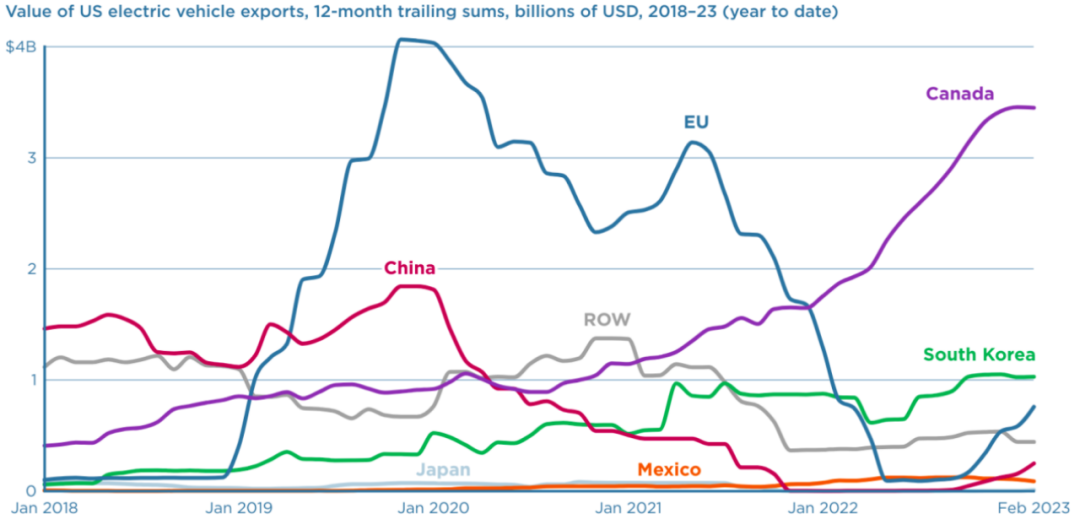 ▲ 贸易摩擦关税导致美国电动汽车对华出口全军覆没,对欧盟的出口也受到影响,但对加拿大的出口有所增长;ROW=世界其他地区(资料来源:美国国际贸易委员会)