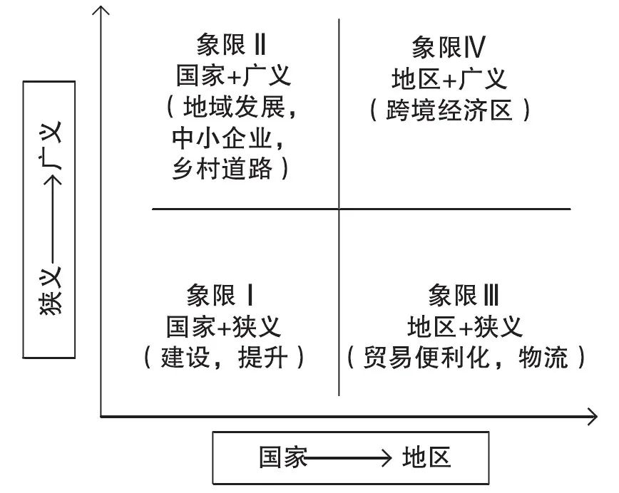 理解跨国经济走廊的概念需要类型学的识别方法。普拉迪普·斯里瓦斯塔瓦基于“国家-地区”的倾向程度和“狭义-广义”的投资范围为我们提供了一个象限分析框架(见图1),其中象限Ⅰ代表了国家倾向和狭义范围阶段的走廊,以道路的初步建设或提档升级为标志,从投资性质来看将持续数年;象限Ⅱ代表了国家倾向和广义范围阶段的走廊,由国家负责拓展走廊的发展和城乡连接,因继续发展基础设施的需要属于“投资密集型”;象限Ⅲ代表了地区倾向和狭义范围阶段的走廊,更加突出跨地区合作,重点是加强和开发已有基础设施的软件功能,相对而言属于“轻投资”类型;象限Ⅳ代表了地区倾向和广义范围阶段的走廊,需要有关国家的联合区域规划和开发,有必要将私营部门的投资活动纳入其中。从象限Ⅰ到象限Ⅳ,走廊完成了从狭窄的民族实体向广阔无缝的跨地区实体的转变,交通走廊实现了向跨国经济走廊的转型升级。