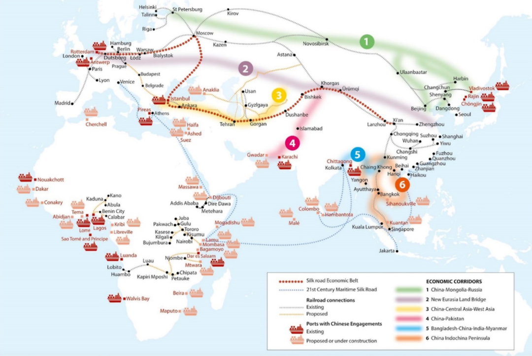 ▲ 中国“一带一路”倡议涉及的六条重要跨国经济走廊,包括:中蒙俄走廊、新欧亚大陆桥、中国-中亚-西亚经济走廊、中巴经济走廊、孟中印缅经济走廊、中国-中南半岛经济走廊。图源:OECD