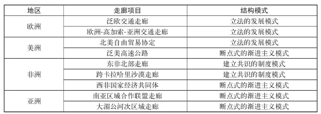 表1. 世界主要跨国经济走廊的结构模式归属