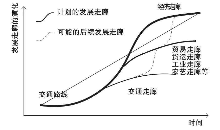 从阶段性逻辑的视角把握跨国经济走廊倾向于将其看作是一个动态演化的过程,其在遵循走廊阶段性演进逻辑的基础上将其扩展至跨国层面。鲁斯·班睦雍将走廊发展归纳为四个阶段:交通走廊、多模式交通走廊(Multimodal Transport Corridor)、物流走廊(Logistics Corridor)和经济走廊。在他看来,交通走廊只关注地区的物理连接;多模式交通走廊强调物理连接的多重方式;物流走廊不仅强调物理连接,而且关注协调走廊货物、人员、信息的制度框架;经济走廊还需能够在欠发达地区吸引投资和产生经济活动。普拉迪普·斯里瓦斯塔瓦侧重于(跨国)地区走廊的研究,将其分为交通走廊、交通和贸易便利化走廊(Transport and Trade Facilitation Corridor)、物流走廊、城市发展走廊(Urban Development Corridor)和经济走廊五个阶段。他预见了尽管走廊的不同阶段会有重叠,但有明确的发展顺序,且与经济学家沃尔特·罗斯托提出的“增长阶段”结构线非常相似。埃尔比·霍普和约翰·考克斯基本遵循了班睦雍对走廊发展阶段的认知,但他们以发展走廊为高阶目标勾勒出一幅走廊演进的时间图谱(见图2)。依据该图谱不难发现,从交通走廊到经济走廊的进阶并不是直线上升式的,而是历经了曲折和分化,最终只有一部分走廊能够按计划完成经济走廊的使命。