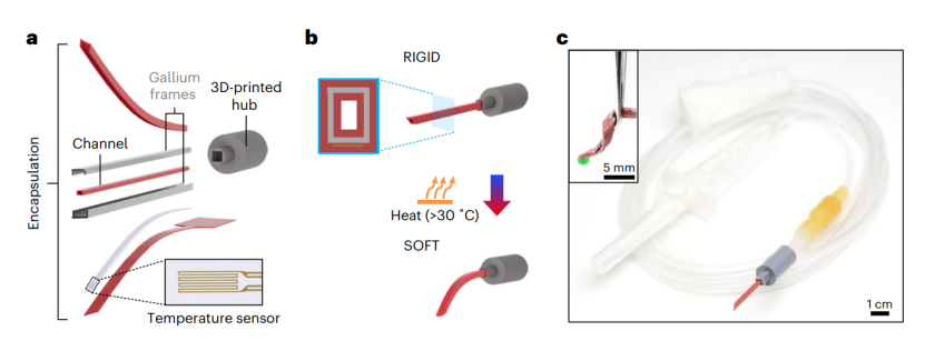 静脉滴注(俗称输液)是医院常用的医学干预措施之一,可快速递送治疗药物。但是,输液常用的钢制针头有一个明显的弊端。患者在输液期间不能自由活动,以免针头移位刺穿静脉,造成其他组织损伤。近日,韩国科学技术院电气工程学院Jae-Woong Jeong团队设计出一种能随体温软化的输液针头P-CARE。P-CARE的中心是一个软化的液体通道,外周是一层金属镓和一个薄膜温度传感器,被特殊材料包裹后固定在3D打印的针座上。通过静脉模型和离体猪组织实验,研究人员证实,P-CARE具有足够的坚韧度刺入软组织,并能在刺入后发生不可逆的软化来适应静脉血管的走向。在小鼠实验,P-CARE与规格相似的商品化针头的静脉滴注效力不相伯仲,引起的炎症更加轻微。并且,P-CARE自带的薄膜温度传感器还可用于监测体温。
