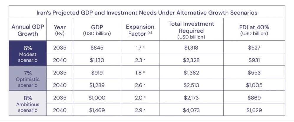 在当前的经济制裁下,伊朗自2020年以来平均经济增长率为4%,但由于基础设施投资不足,该国难以维持这一增长率。若制裁取消,根据2016年麦肯锡全球研究院的一项研究显示,伊朗的增长率可达6.3%。与此同时,伊朗政府甚至将目标定为8%,到2040年时,其国内生产总值可增加6000亿至1万亿美元。为实现这一目标,伊朗到2040年时将需要约2.3万亿至4万亿美元的资本。这并非不可能,但需要依靠伊朗政府、伊朗私营部门和外国直接投资共同筹集所需资金。