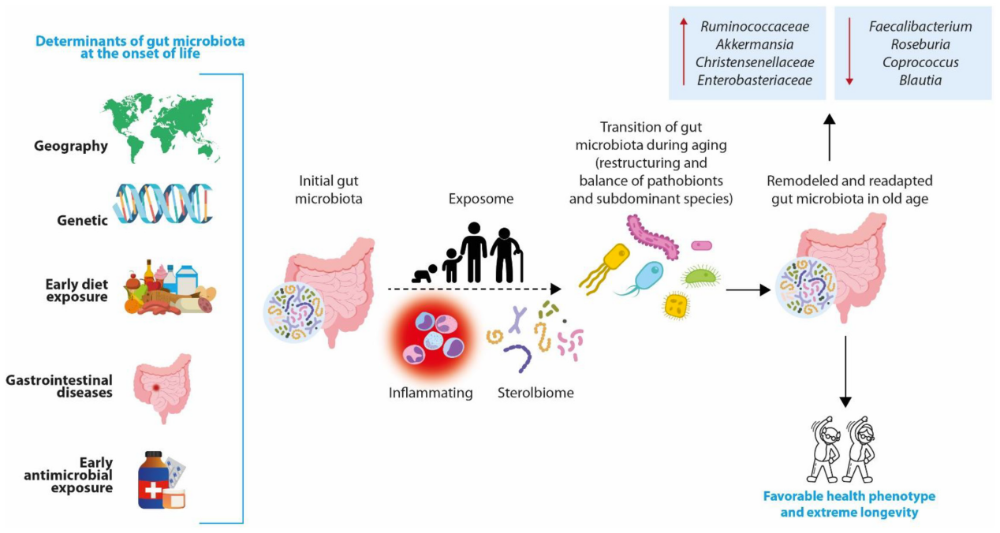 肠道菌群在生命中的演化及其在衰老阶段如何重塑和适应,从而促成健康长寿和突破性寿命的关键机制。| 图源:参考文献[6]