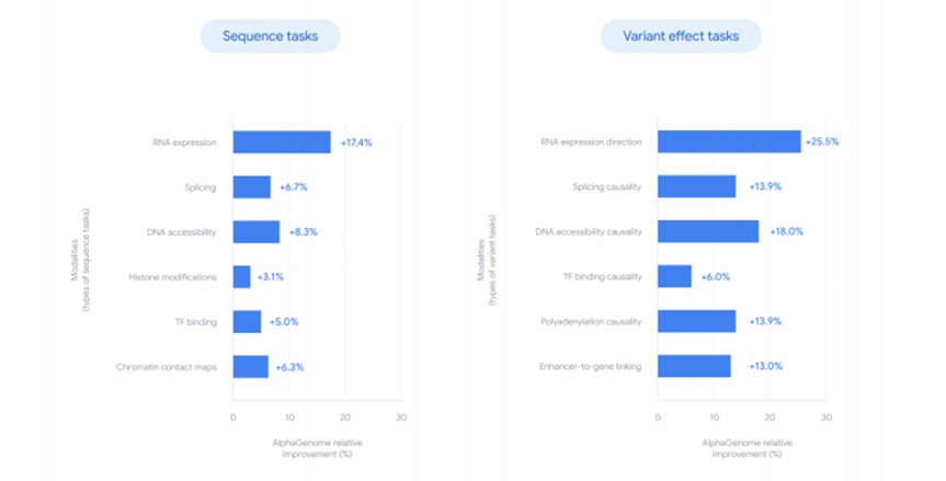 图2:相比现有最好工具,AlphaGenome在基于DNA序列预测DNA分子哪些部分将彼此靠近、遗传变异是会增加还是减少基因表达,或者是否会改变基因剪接模式上的准确性提升。